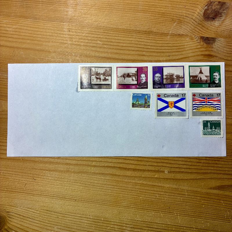 This really only applies for single envelopes under 30g, but for the 0-30g lettermail service Canada Post has two rates: Counter and Booklet. The booklet rate is always cheaper than the counter rate. As of writing, those rates are $1.24 (booklet) and $1.44 (counter). If you are combining denominated stamps ($0.37, $0.89, etc) you only need to combine enough stamps to total the booklet rate, not the counter rate. The reason for this is because the counter rate represents the booklet rate plus an invisible surcharge for only buying one stamp at the counter (they want you to buy booklets of 10). In this case the difference between $1.24 and $1.44 is $0.20, so that $0.20 represents the invisible surcharge for the action of only buying a single stamp at the counter - it is not part of the actual lettermail rate. This is why you should be using the booklet rate for your target value when combining stamps, because if you use the counter rate you will be overpaying postage for no reason.